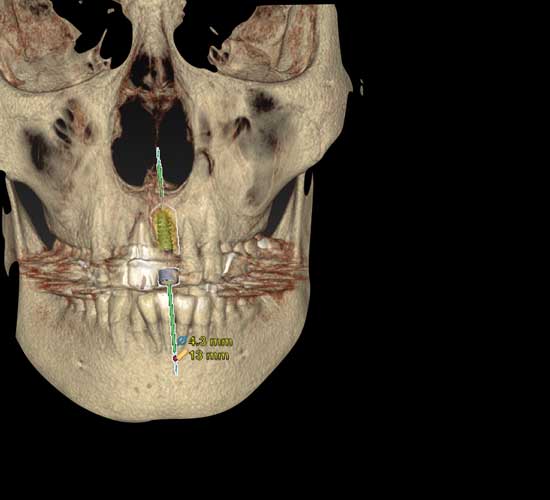 前歯のインプラント治療は、診査・診断・治療計画が全てです。骨のある位置に当てずっぽうに、フリーハンドでインプラントを埋入するのではなく、3Dシミュレーションを行い、計画的に間違いの起こらない方法で埋入することが肝心です。また、痛みを抑えて、出来るだけ治療回数を少なく、治療期間を短く、患者様の負担の少ない即時荷重(手術と同時に仮歯を入れ、見た目と機能を早期に回復する治療)を目指します。