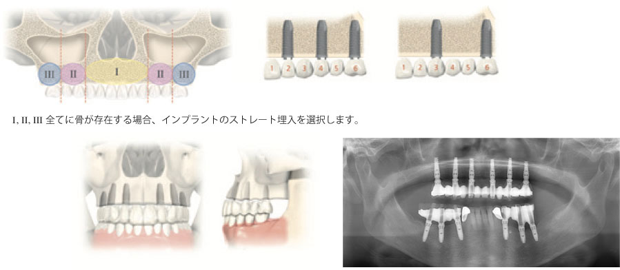 臼歯部に骨量が十分になく、インプラントのストレート埋入が難しい場合、オールオン4を選択します。 傾斜埋入によって上顎洞を避けるとともに、限られた骨量でも十分な支持力を維持することが可能です。