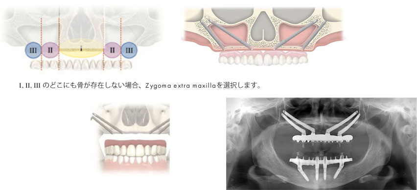 上顎のどこにも十分な骨が残っていない場合、左右2本ずつ、頬骨にインプラントを埋入します。(Zygoma extra maxilla)